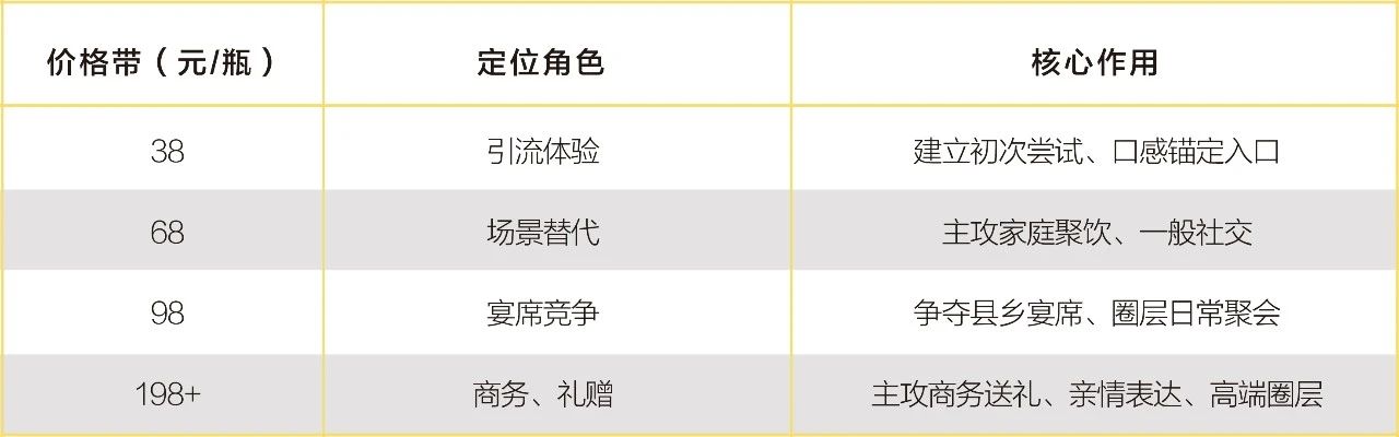 次高端價格帶面臨“雙向擠壓”的困境,向上打不動高端,消費者愿為高端稀缺性溢價,但對“類高端”溢價抗拒;向下?lián)醪蛔“僭馄?,渠道利潤更高的百元產(chǎn)品,正在侵蝕次高端的宴席份額。多數(shù)次高端品牌缺乏清晰的產(chǎn)品錨點和情感訴求,定位模糊,迫切需要在品牌價值重塑與產(chǎn)品功能重構(gòu)上下功夫。