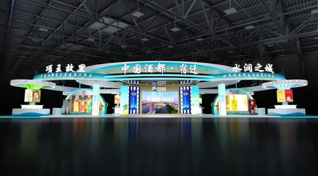 “水潤之城”打造了沉浸式空間的文化與品質訴說。本次宿遷展區的設計別具匠心,以“水潤之城”為主題的沉浸式空間,將產區的自然稟賦、歷史文脈與產業特質融為一體。展區采用環形流線設計,巧妙串聯起“項王故里”的歷史底蘊與“綿柔型白酒發展引領區”的產業定位。設計元素中深度融入了宿遷“三河兩湖一濕地”的獨特水域格局,通過波浪形結構等視覺語言,直觀而藝術地詮釋了“水釀綿柔”的產區密碼。