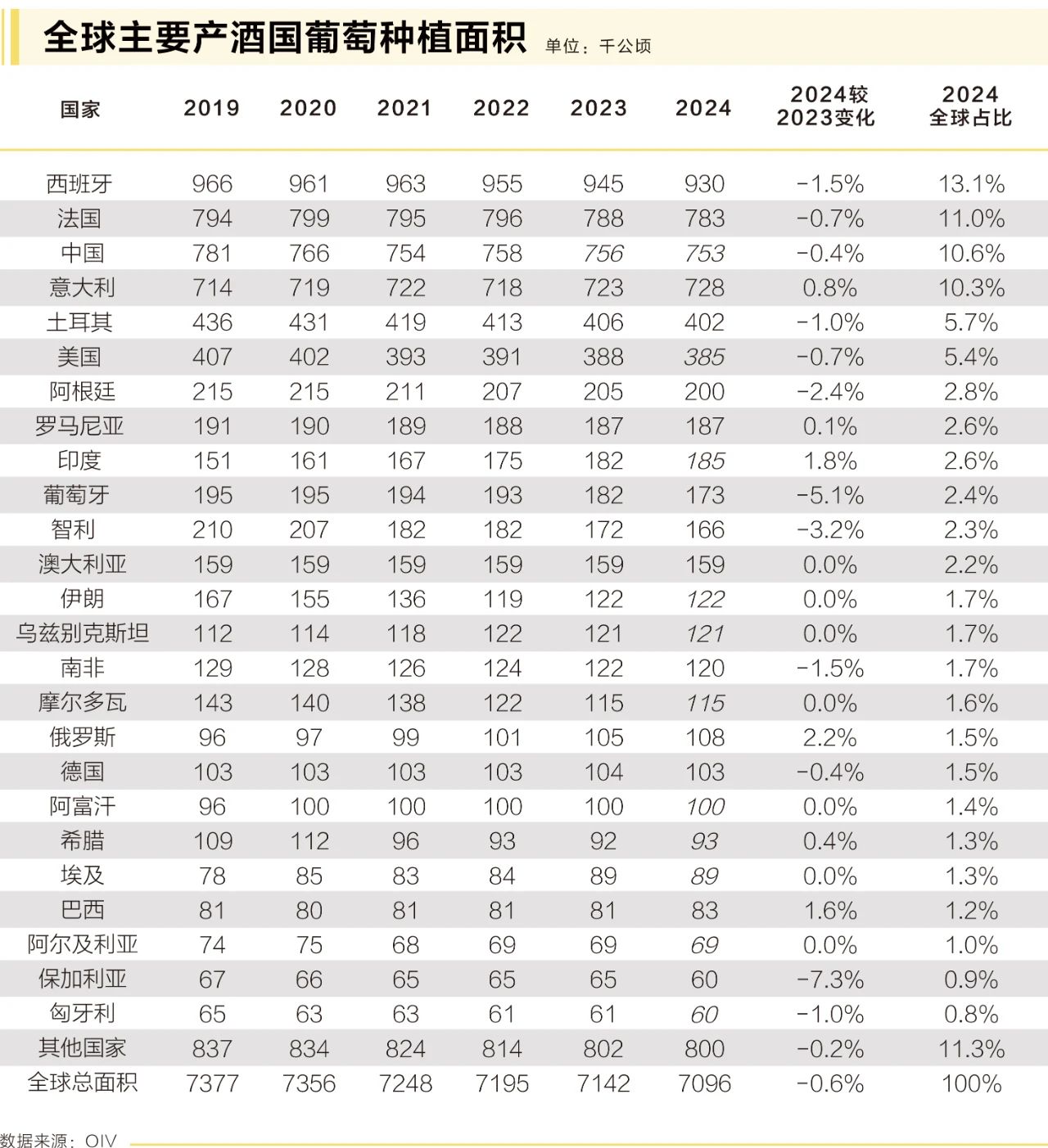 中國葡萄園面積穩(wěn)定在75.3萬公頃(-0.4%),結(jié)束了2000年-2015年期間年均4.2%的高速擴(kuò)張期;美國加州面積縮減至38.5萬公頃,較2013年峰值縮水15%,納帕谷部分酒莊被迫改種杏仁等經(jīng)濟(jì)作物。