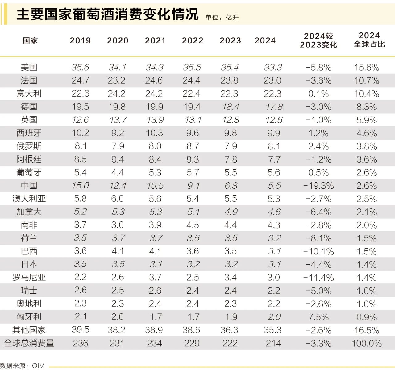 2024年,全球葡萄酒消費(fèi)量下降3.3%至214.2億升,創(chuàng)1961年以來最低值。傳統(tǒng)市場普遍增長放緩:中國消費(fèi)量暴跌19.3%至5.5億升,自2018年年均減少2億升;美國消費(fèi)量下降5.8%至33.3億升,Z世代轉(zhuǎn)向精釀啤酒與即飲雞尾酒(RTD)導(dǎo)致商超渠道銷量減少12%;歐盟消費(fèi)量減少2.8%至103.6億升,老齡化與家庭消費(fèi)收縮為主要拖累因素,法國(23.0億升,-3.6%)與德國(17.8億升,-3.0%)餐飲渠道銷量分別下降8%與6%,西班牙(9.9億升,+1.2%)通過低價散裝酒內(nèi)銷策略,成為歐盟唯一增長市場。