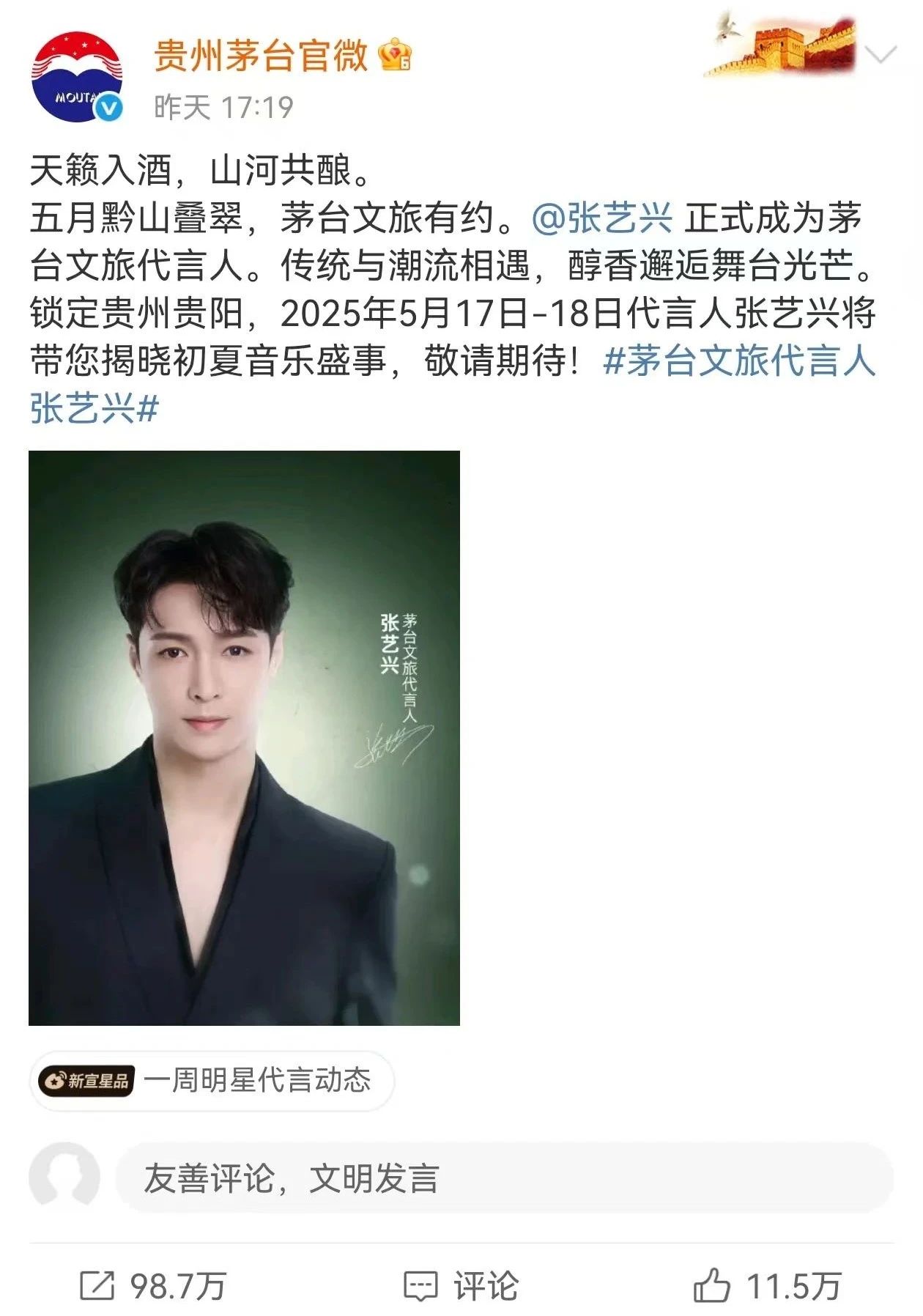 5月7日,貴州茅臺官微宣布:“張藝興正式成為茅臺文旅的代言人。傳統(tǒng)與潮流相遇,醇香邂逅舞臺光芒。鎖定貴州貴陽,2025年5月17日-18日代言人張藝興將帶您揭曉初夏映月盛事,敬請期待。”