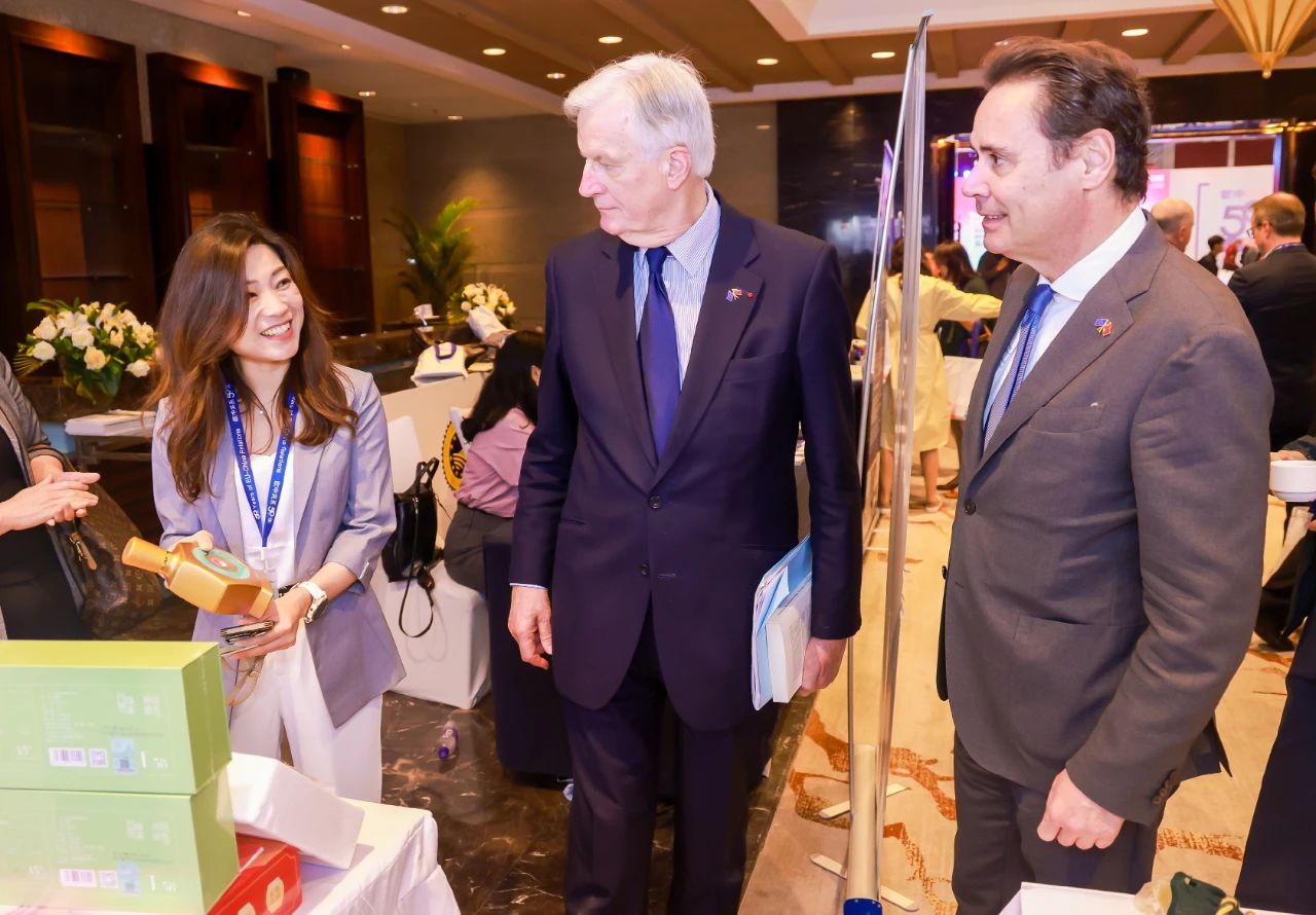 工作人員向法國前總理、歐洲委員會英國退歐首席談判代表米歇爾·巴尼耶介紹國井產品