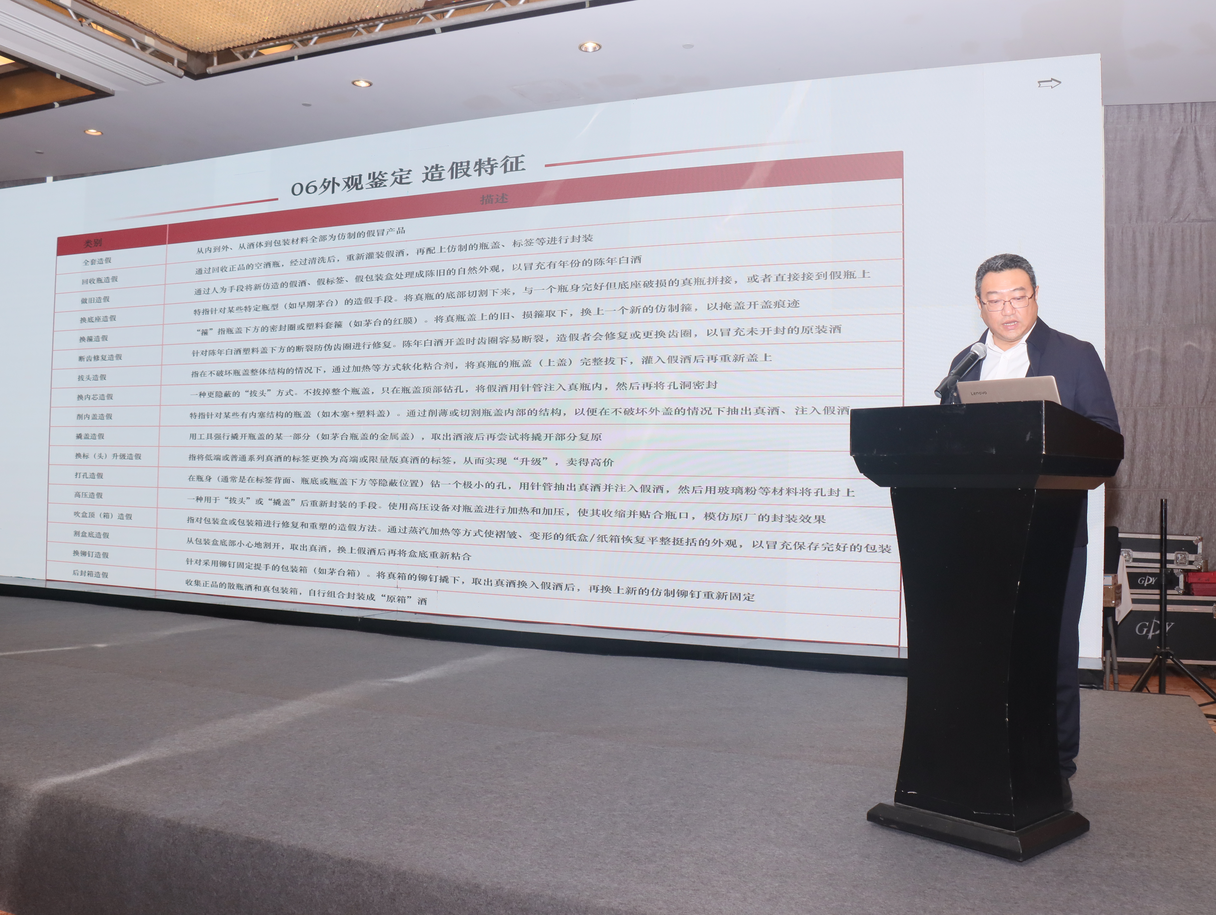 奚玉明對《陳年白酒流通鑒定規范》進行了深度的解讀。他指出,該標準規定了陳年老酒流通鑒定的總則、鑒定機構和人員要求、外觀鑒定、鑒定品相、鑒定評級、鑒定結果等內容,為灌裝出廠后儲存5年以上、外觀未改動的陳年白酒建立了系統化鑒定依據,核心是通過標準化外觀流程,對整箱和單瓶酒的包裝、標簽、瓶蓋等細節進行真偽查驗。標準還首創了量化品相評級體系,通過百分制綜合評分將酒品劃分為A到D四個等級,使其品相與市場價值直接關聯,從而終結以往依賴個人經驗的鑒定亂象。