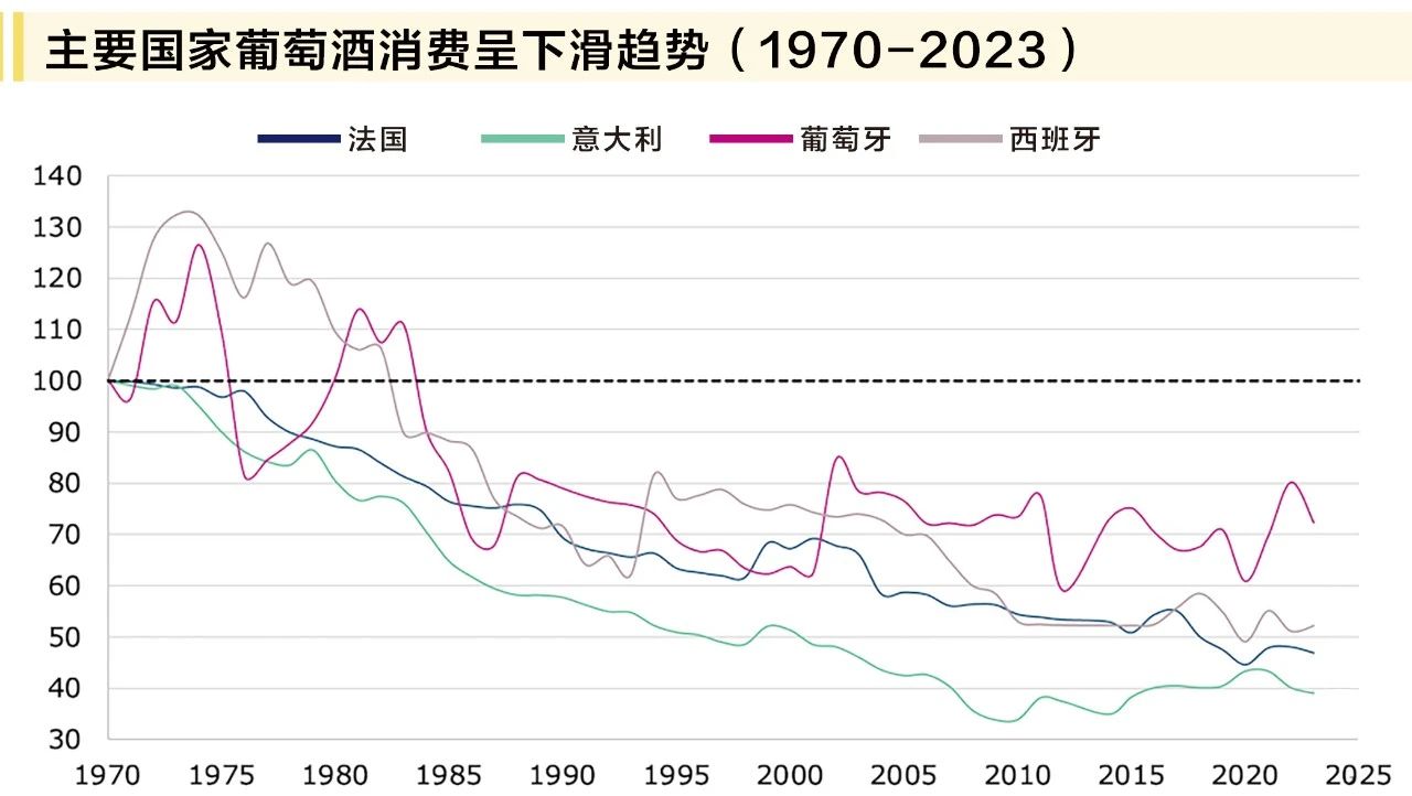 荷蘭合作銀行(Rabobank)飲品研究副總裁Bourcard Nesin以一張圖表揭開序幕:葡萄牙、西班牙、法國、意大利四國過去55年的葡萄酒消費曲線持續下行,當前消費量僅為1970年的一半,而同期人口增長30%。“出口市場曾是美國市場規模翻倍的救命稻草,但增長早在10年前停滯。”他直言,2008年金融危機后的平緩期在2017年急轉直下,“如今,我們面對的是結構性衰退,而非周期性波動。”