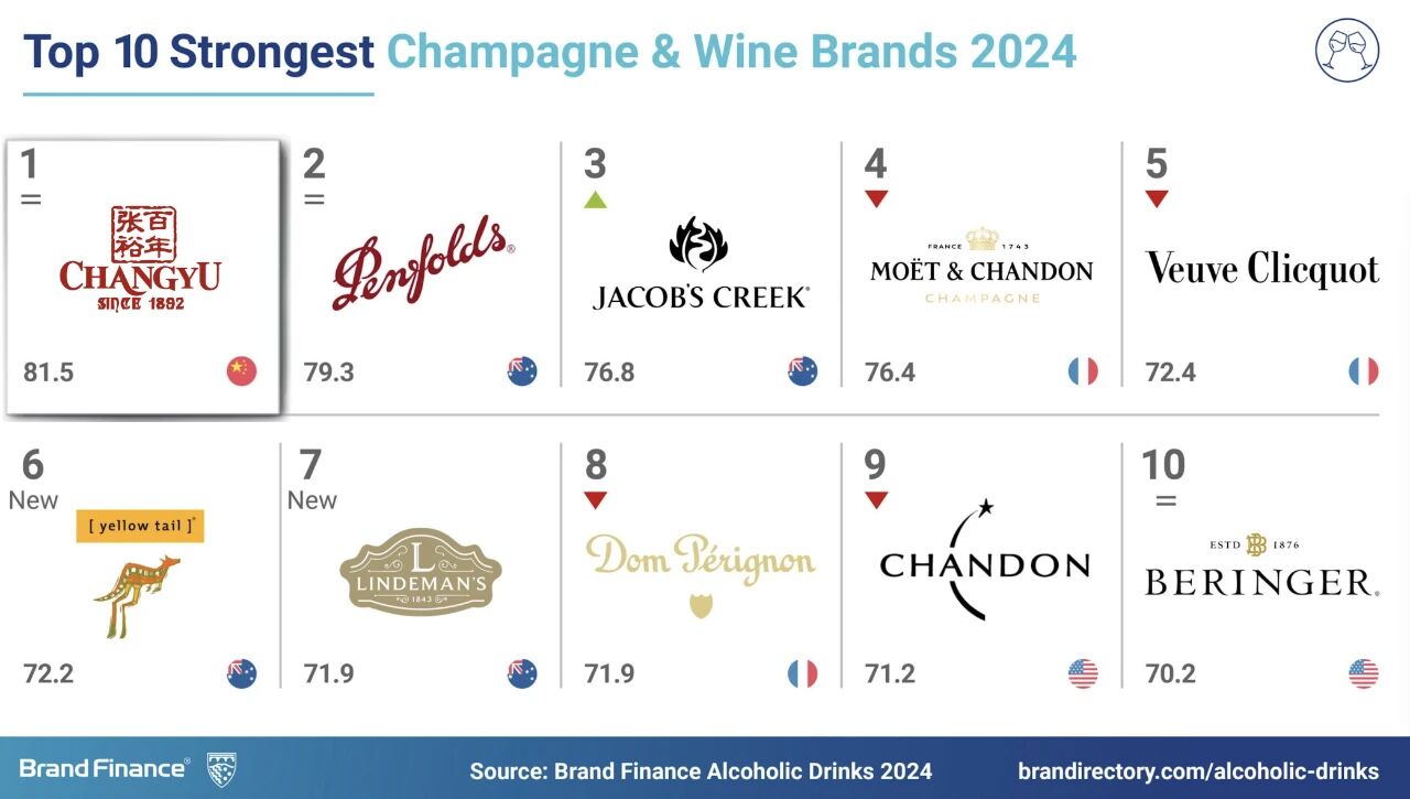 2023年、2024年,張裕連續兩年蟬聯全球權威品牌價值評估機構Brand Finance發布的“全球最強葡萄酒&香檳酒品牌”(World’s strongest Wine & Champagne brands)榜單第一名。