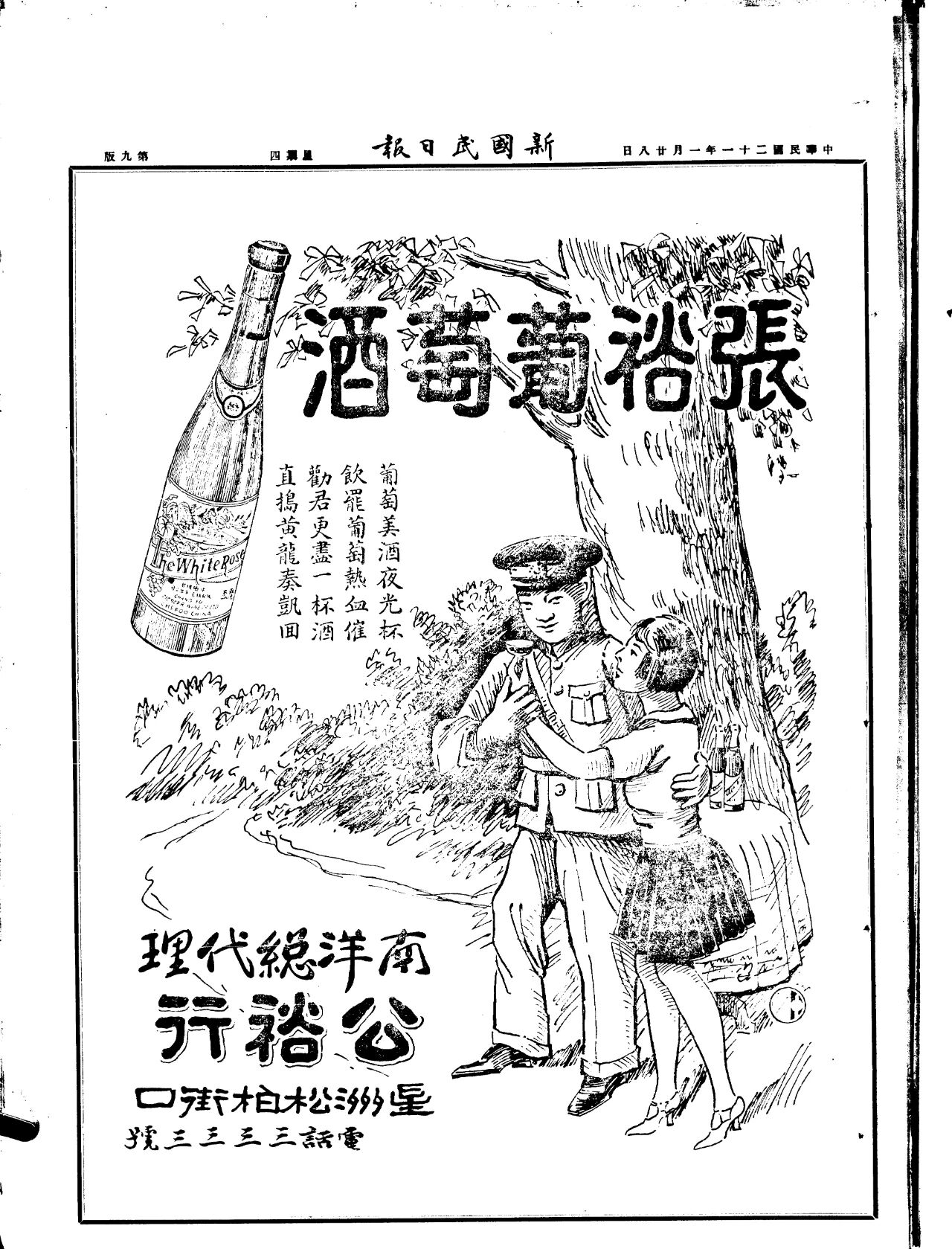 1932年1月28日午夜,“淞滬抗戰”爆發。就在這一天的白天,張裕葡萄酒南洋總代理已經在新加坡《新國民日報》發布廣告,向南洋華僑召喚、為前線將士助威。