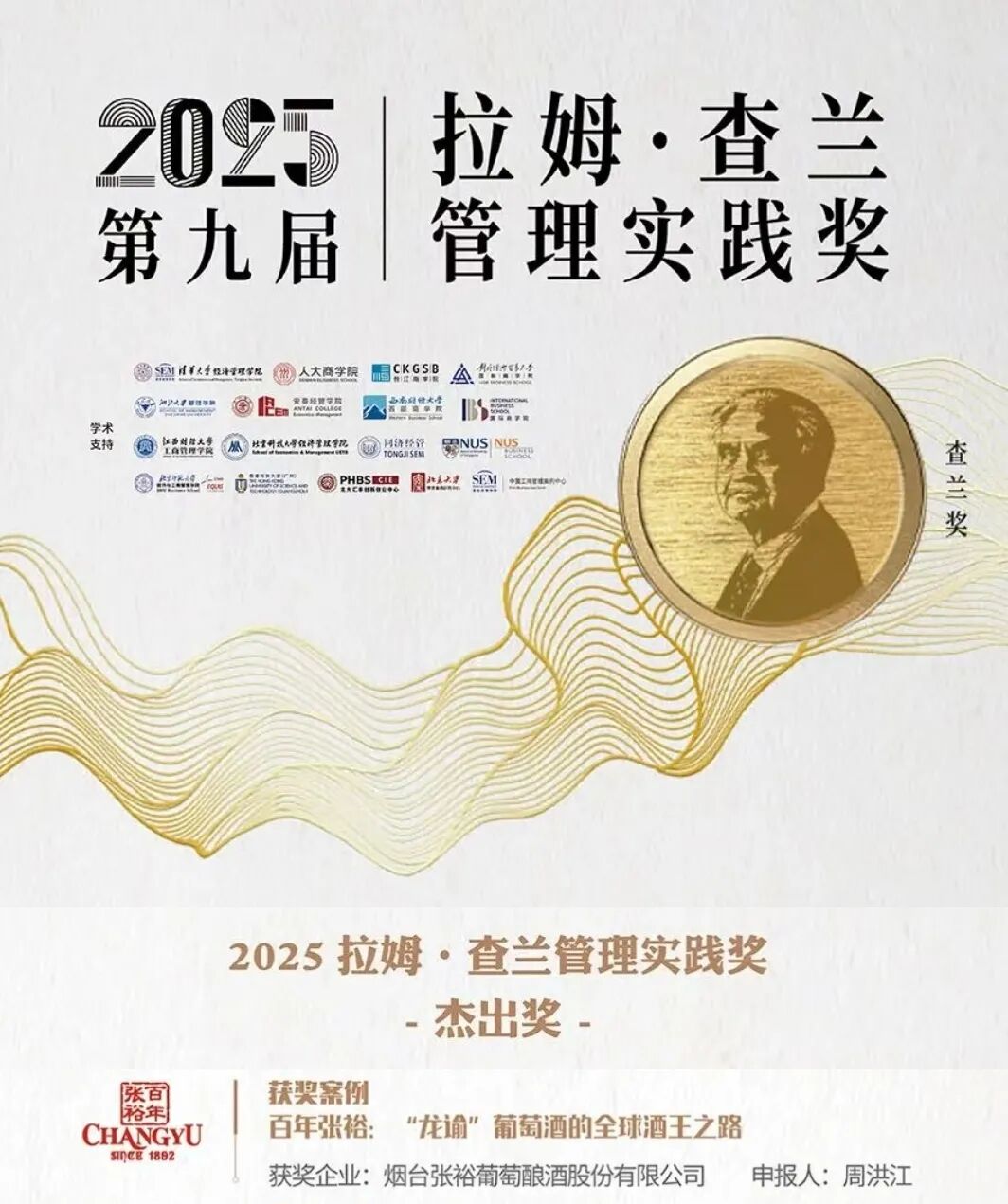 張?jiān)9径麻L周洪江及其管理案例《百年張?jiān)#骸褒堉I”葡萄酒的全球酒王之路》,從全國兩百余個(gè)參評(píng)案例中脫穎而出,榮獲“2025拉姆?查蘭管理實(shí)踐獎(jiǎng)-杰出獎(jiǎng)”,并入選哈佛案例庫。同期入選的還有聯(lián)想集團(tuán)、百勝中國、極氪中國等知名企業(yè)。