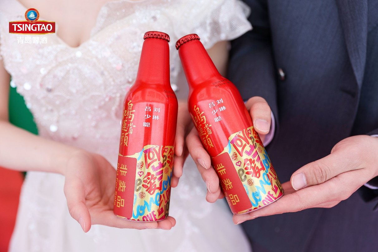 作為青島這座城市的專屬味道,青島啤酒為現場新人特意制作了定制酒——以青島啤酒鴻運當頭的吉慶基因為原點,傳統與現代潮流相結合,吉祥紋飾勾勒,寓意愛情順遂圓滿。瓶身大膽采用炙熱紅、告白粉、誓盟藍、鎏緣金的撞色,繽紛多彩的“love”元素滿布瓶身,似戀人將告白的愛意鐫刻在瓶子上,從甜蜜戀愛到婚宴敬酒到蜜月派對,每一瓶都是不用言語的浪漫助攻,每一瓶都是沉淀永恒的海誓山盟。在精美瓶身鐫刻上新人的名字,為本場集體婚禮增添了儀式感和氛圍感。
