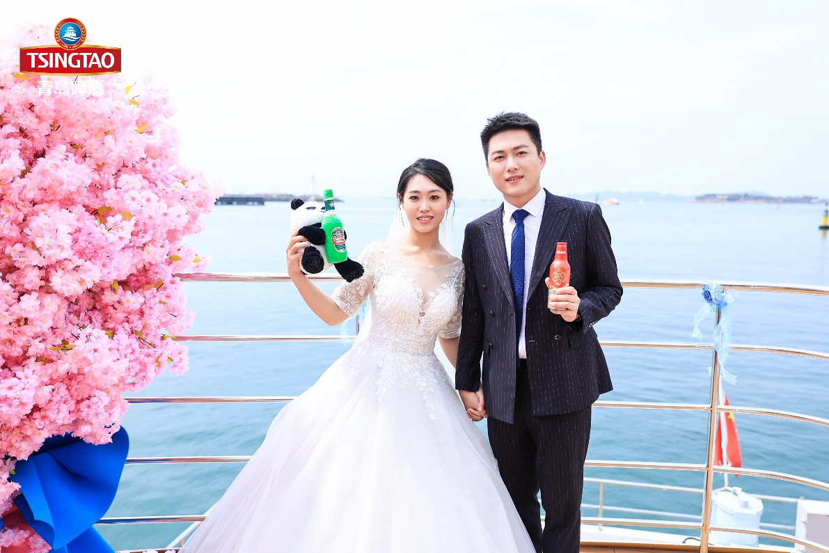 在這個特殊的日子,拿著可有自己名字的青島啤酒專屬定制酒,新人們都感到十分興奮。當滿載著新人的游艇行駛在浮山灣,新人們以青島美麗的天際線為背景,為愛干杯!為美好生活干杯!