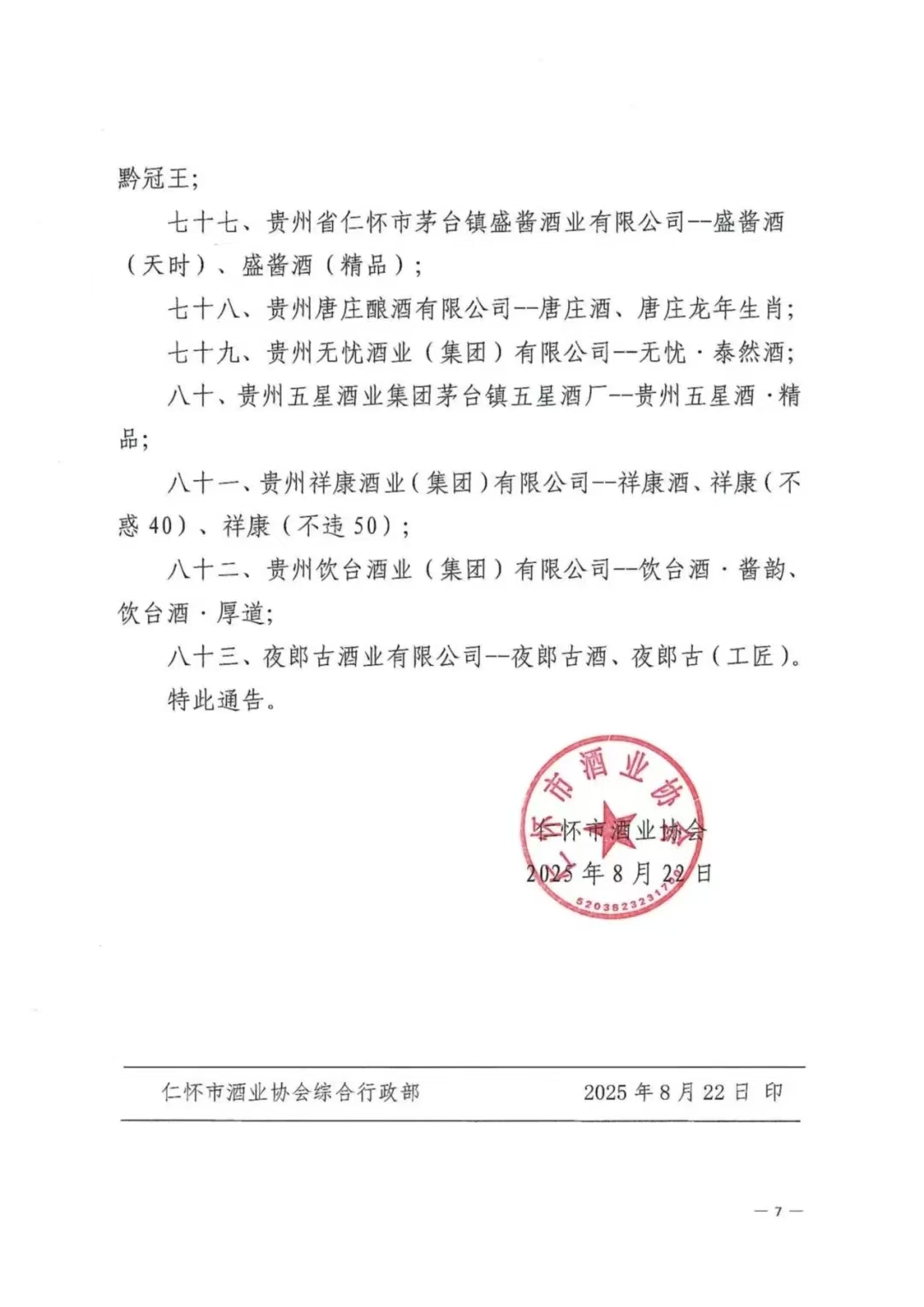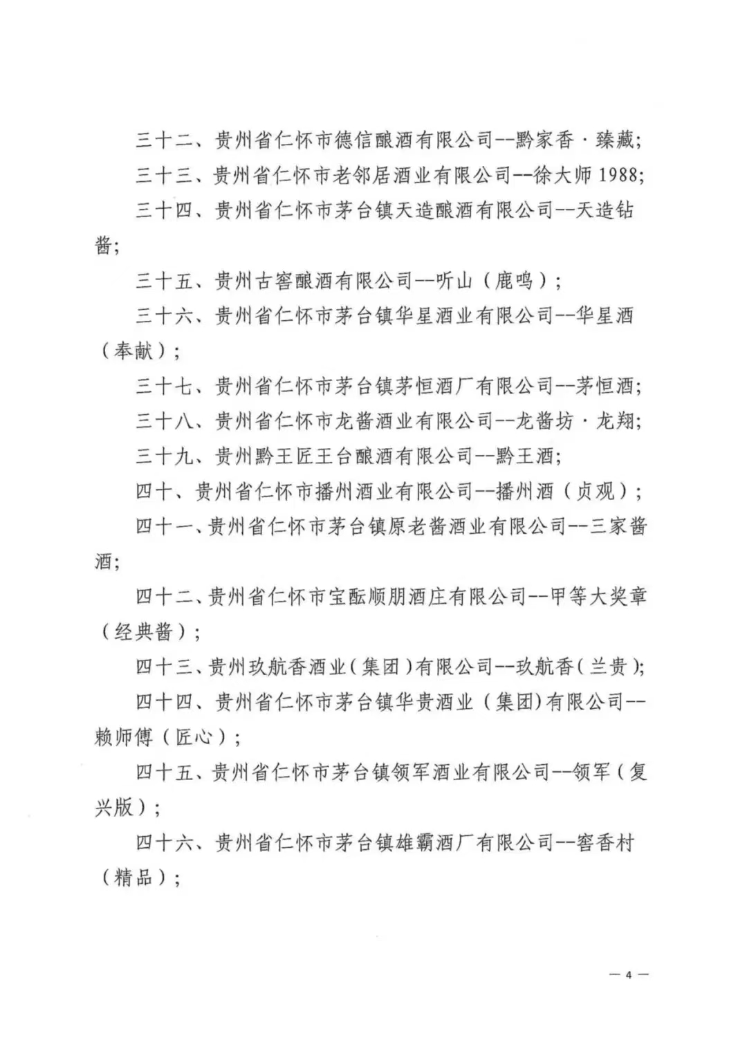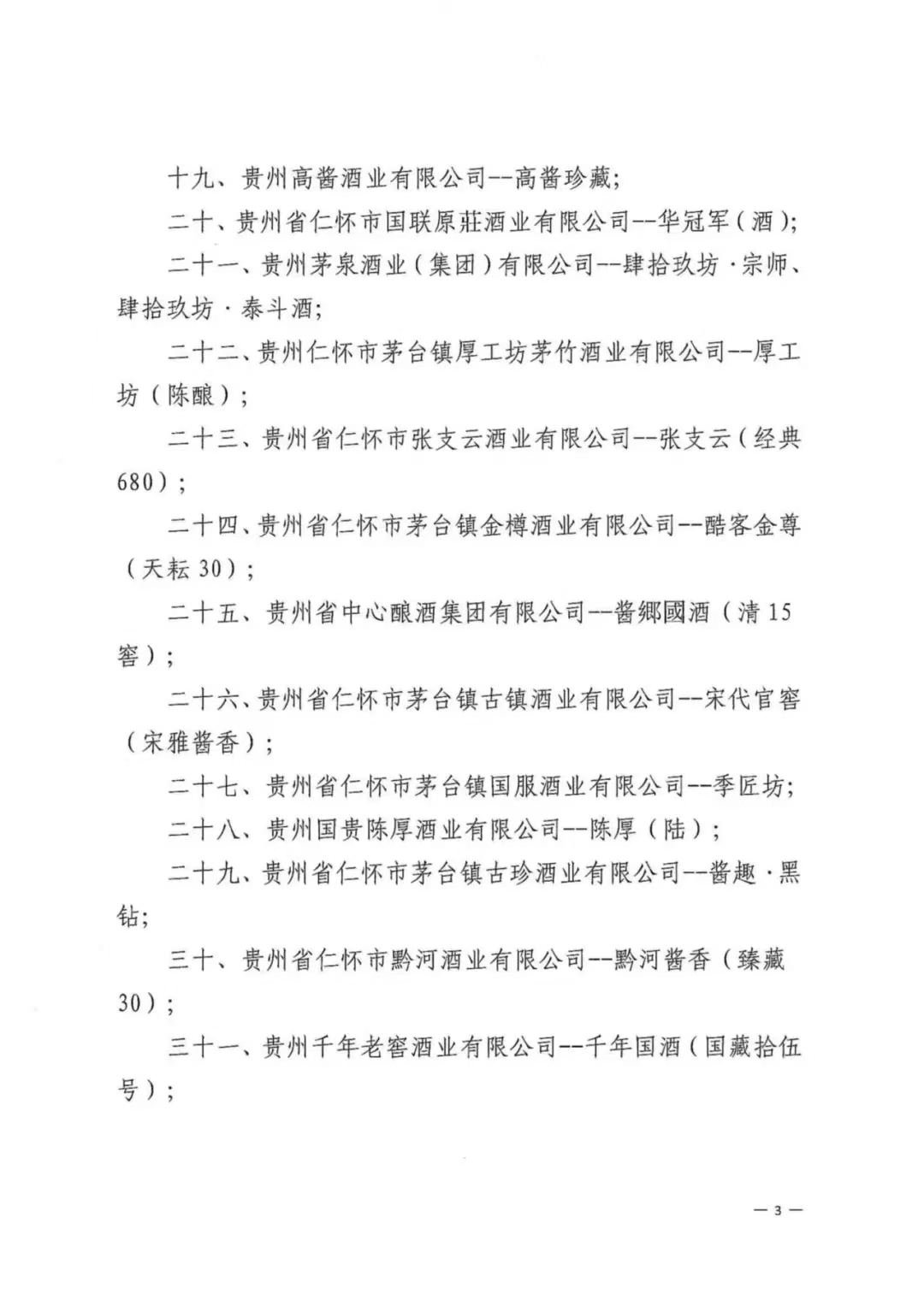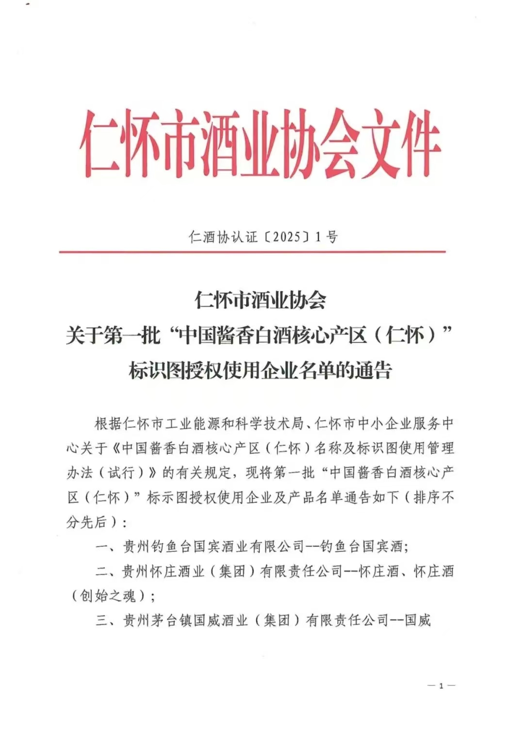 12月25日,據仁懷酒協微信公眾號消息,根據仁懷市工業能源和科學技術局、仁懷市中小企業服務中心關于《中國醬香白酒核心產區(仁懷)名稱及標識圖使用管理辦法(試行)》的有關規定,現公布第一批“中國醬香白酒核心產區(仁懷)”標示圖授權使用企業及產品名單,共有貴州釣魚臺國賓酒業有限公司--釣魚臺國賓酒、貴州懷莊酒業(集團)有限責任公司--懷莊酒、懷莊酒(創始之魂)等83家企業在列(排序不分先后,該通告已于8月份書面印發,此次應讀者要求在官微公開發布)。具體名單如下: