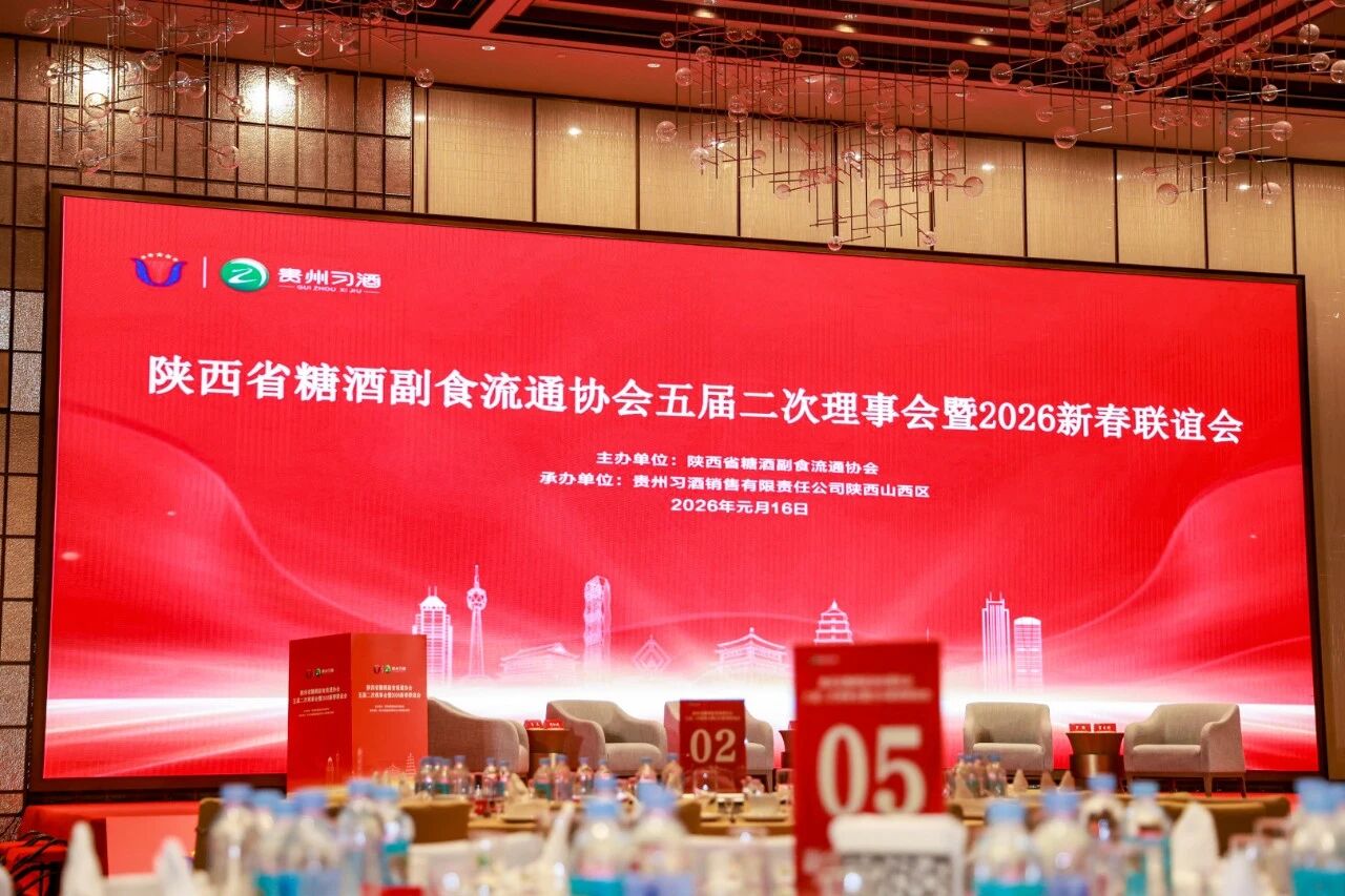 1月16日,陜西省糖酒副食流通協會五屆二次理事會暨2026新春聯誼會在西安洲際酒店舉行。本屆大會由陜西省糖酒副食流通協會主辦,貴州習酒銷售有限責任公司陜西山西區承辦,省商務廳有關部門同志和省市場監督管理局有關部門負責人出席會議,來自全省糖酒副食流通行業的企業代表、協會會員單位、有關商協會負責人、新聞媒體代表300 余人齊聚一堂,本次大會旨在系統總結協會第五屆理事會2025年的工作成果與經驗,共同分析當前陜西糖酒副食流通行業面臨的新形勢與新機遇,并擘畫2026年的發展藍圖,這場承前啟后、凝聚行業力量的酒業盛會。