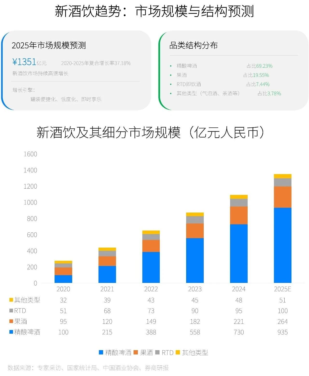 近日,新經銷與瓶子星球聯合發布的《2025新酒飲行業發展報告》(以下簡稱《報告》)揭示,2025年,新酒飲市場規模預計達1351億元,2020年-2025年復合增長率高達37.18%,成為酒業增長最迅速的板塊。這并非一次簡單的品類輪動,而是一場由消費價值觀根本性遷移所驅動,從產品定義、流通模式到消費場景全面重構的產業革命。