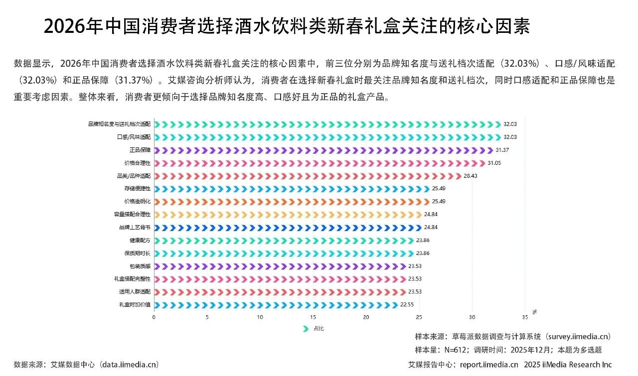 艾媒咨詢最新發布的《2026年中國新春禮盒消費行為調研數據》顯示,零食點心和酒水飲料類成為新春禮盒消費最受歡迎的品類,占比均超過40%。“品牌”是消費者購買酒水飲料禮盒首要考量的因素。這也解釋了為何在行業整體收縮的市場中,名酒的光瓶酒或低線產品仍能脫穎而出。汾酒的玻汾、五糧液的尖莊等,都憑借其強大的品牌背書和親民價格,穩穩承接了這波由場景變遷帶來的紅利。