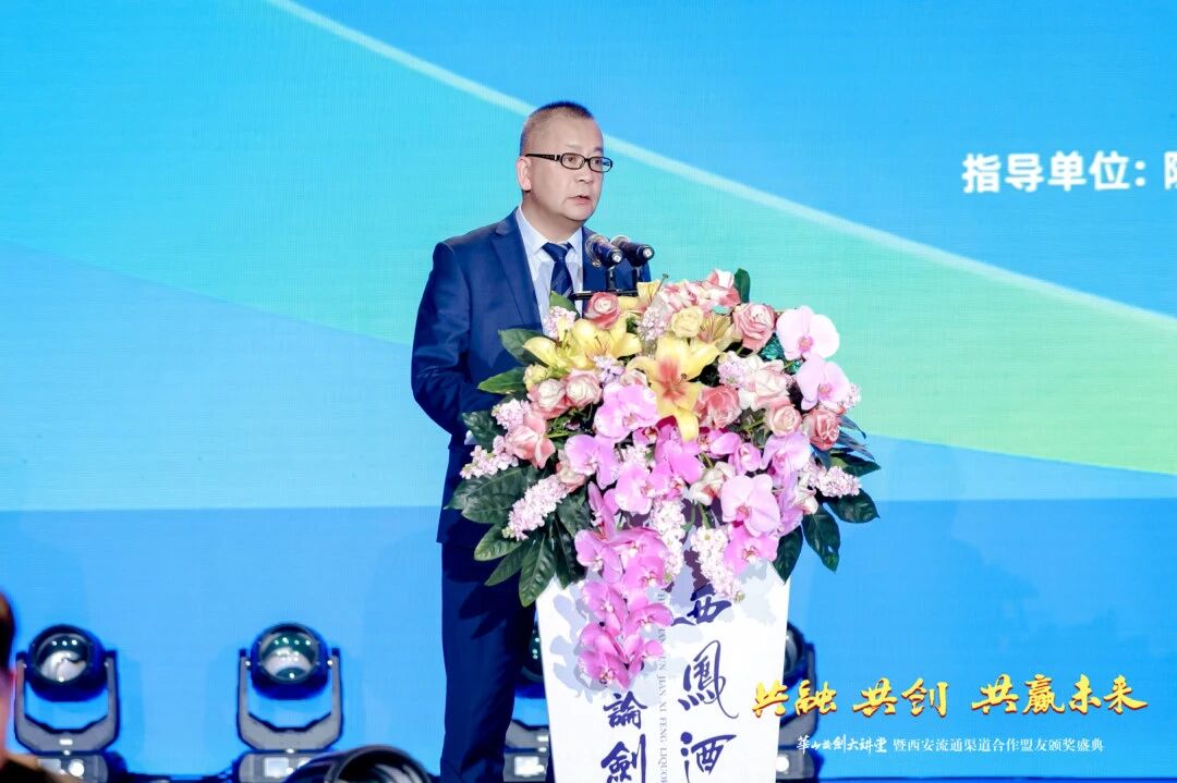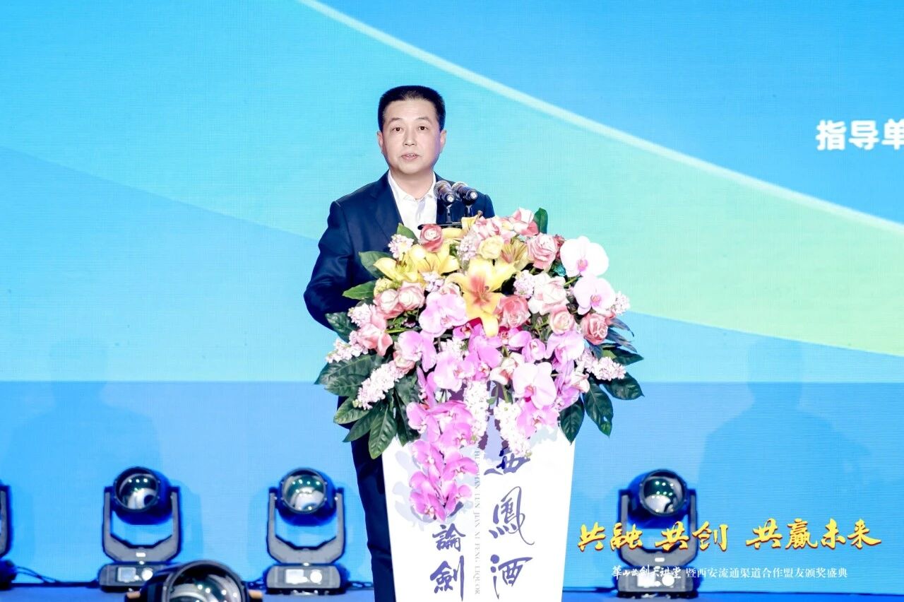 陜西西鳳酒股份有限公司副總經(jīng)理肖寧講話,他講到西安是華夏文明根脈、盛唐風(fēng)華之地,更是西鳳酒的故土,這片土地上三千年鳳香文化與長(zhǎng)安文脈深度共鳴。他介紹,近年來(lái)西鳳酒正錨定“重返一流名酒序列”戰(zhàn)略目標(biāo),推進(jìn)產(chǎn)能建設(shè)、品質(zhì)提升、市場(chǎng)拓展、品牌打造等系列戰(zhàn)略性工作,為市場(chǎng)發(fā)展提供堅(jiān)實(shí)基礎(chǔ)。他贊賞品牌以“勇智敏仁”為文化內(nèi)核,在“打造中國(guó)文化白酒第一品牌”的道路上取得輝煌成績(jī),為西鳳酒市場(chǎng)拓展做出積極重要貢獻(xiàn)。面對(duì)行業(yè)轉(zhuǎn)型與政策利好,他期望華山論劍西鳳酒搶抓機(jī)遇、深耕市場(chǎng),西鳳酒將堅(jiān)持廠商同心、共創(chuàng)共享、長(zhǎng)期共贏,全力支持核心品牌做強(qiáng)做大,共譜高質(zhì)量發(fā)展新篇章。