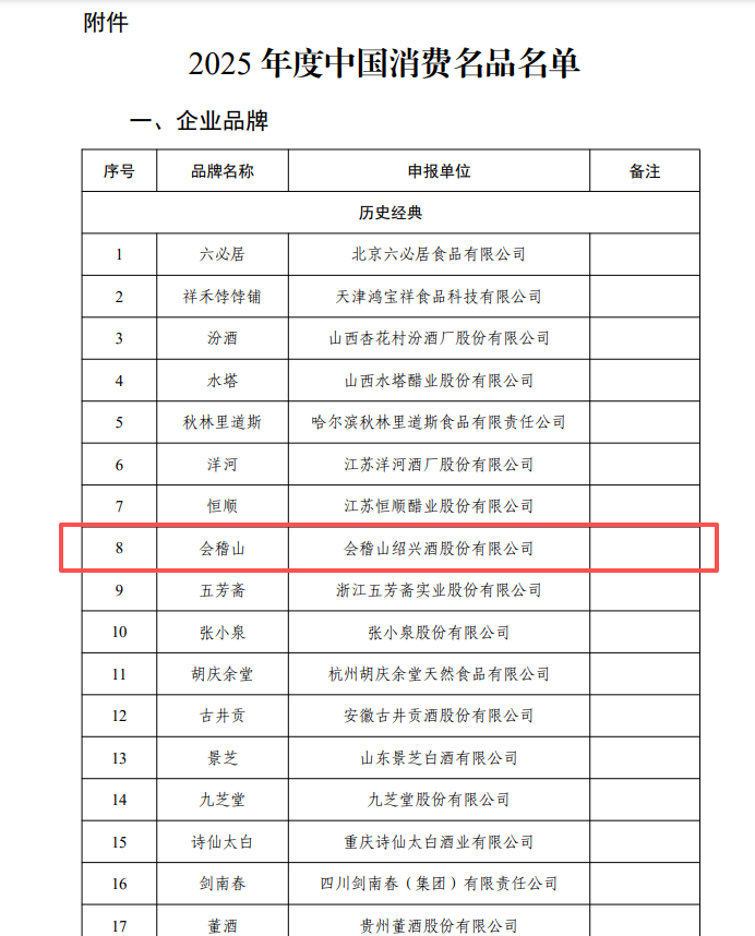 值得關(guān)注的是,本次與會(huì)稽山一同入選的還有汾酒、洋河、古井貢酒、劍南春、董酒等多家白酒名企。歷史總是遙相呼應(yīng)——1952年,會(huì)稽山前身“鑒湖長(zhǎng)春酒”曾與汾酒等同臺(tái)榮獲新中國(guó)首屆八大名酒;七十余年后,兩者再次共同躋身國(guó)家級(jí)消費(fèi)名品行列,見(jiàn)證了中國(guó)酒業(yè)經(jīng)典的傳承與延續(xù)。