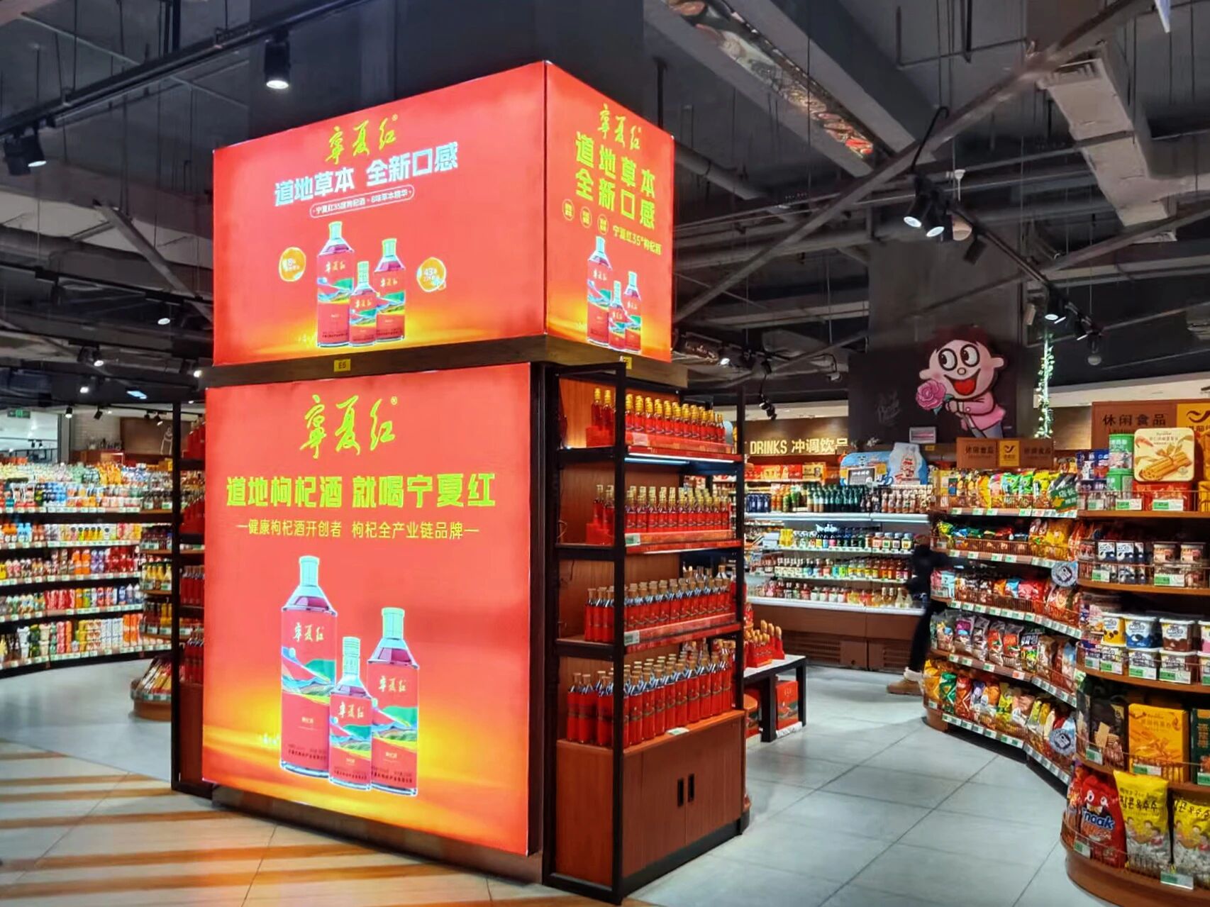 一是氛圍先行,打造“春節(jié)必見”的沉浸氛圍。春節(jié)消費的核心動力之一是“氛圍感驅動”,寧夏紅遵循“全域統一、重點突出、體驗沉浸”的原則,在商超、賣場、便利店及社區(qū)零售點等核心渠道,構建層次分明的終端陳列矩陣。以紅色為主視覺,通過主題堆頭、端架陳列、品牌專區(qū)等形式,實現規(guī)模化、差異化的視覺呈現,塑造“春節(jié)必見寧夏紅”的強品牌記憶,將終端打造為品牌與消費者的情感連接點,為后續(xù)轉化奠定認知基礎。